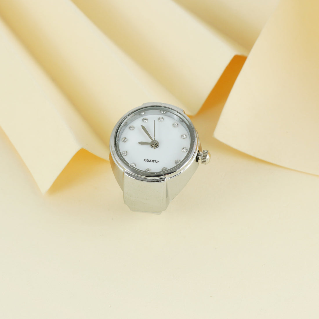 A sleek ring watch with a classic white dial and silver finish, crafted on a...