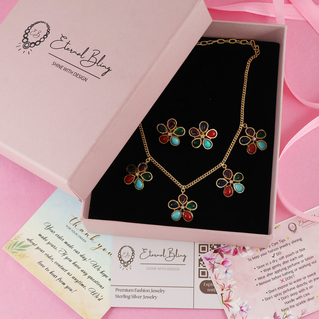 A charming necklace featuring multiple floral motifs, crafted on a brass base with anti-tarnish plating...