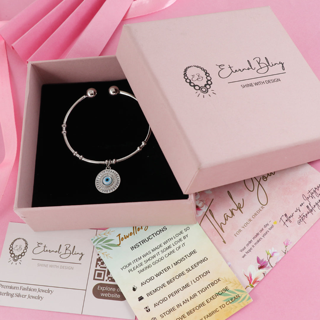 A sleek Italian evil eye kada in 925 sterling silver, designed to offer both style and symbolic protection for modern women.